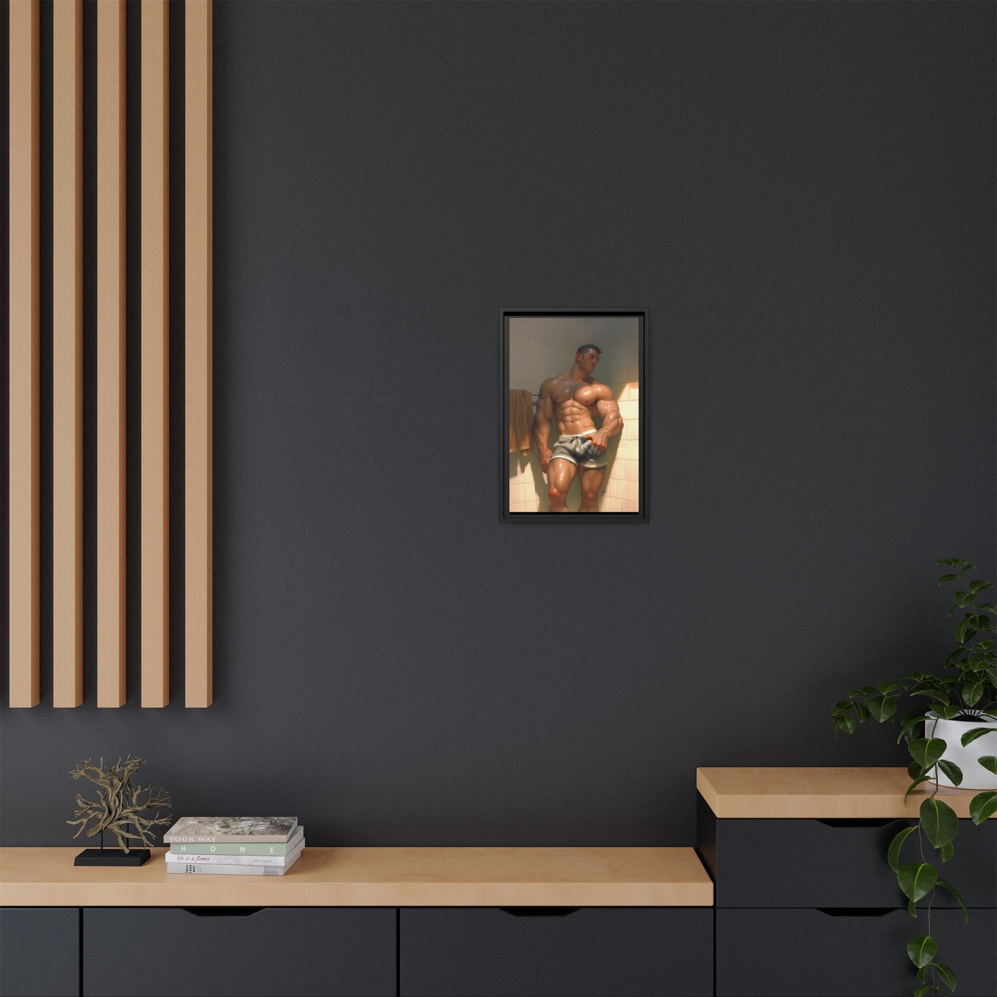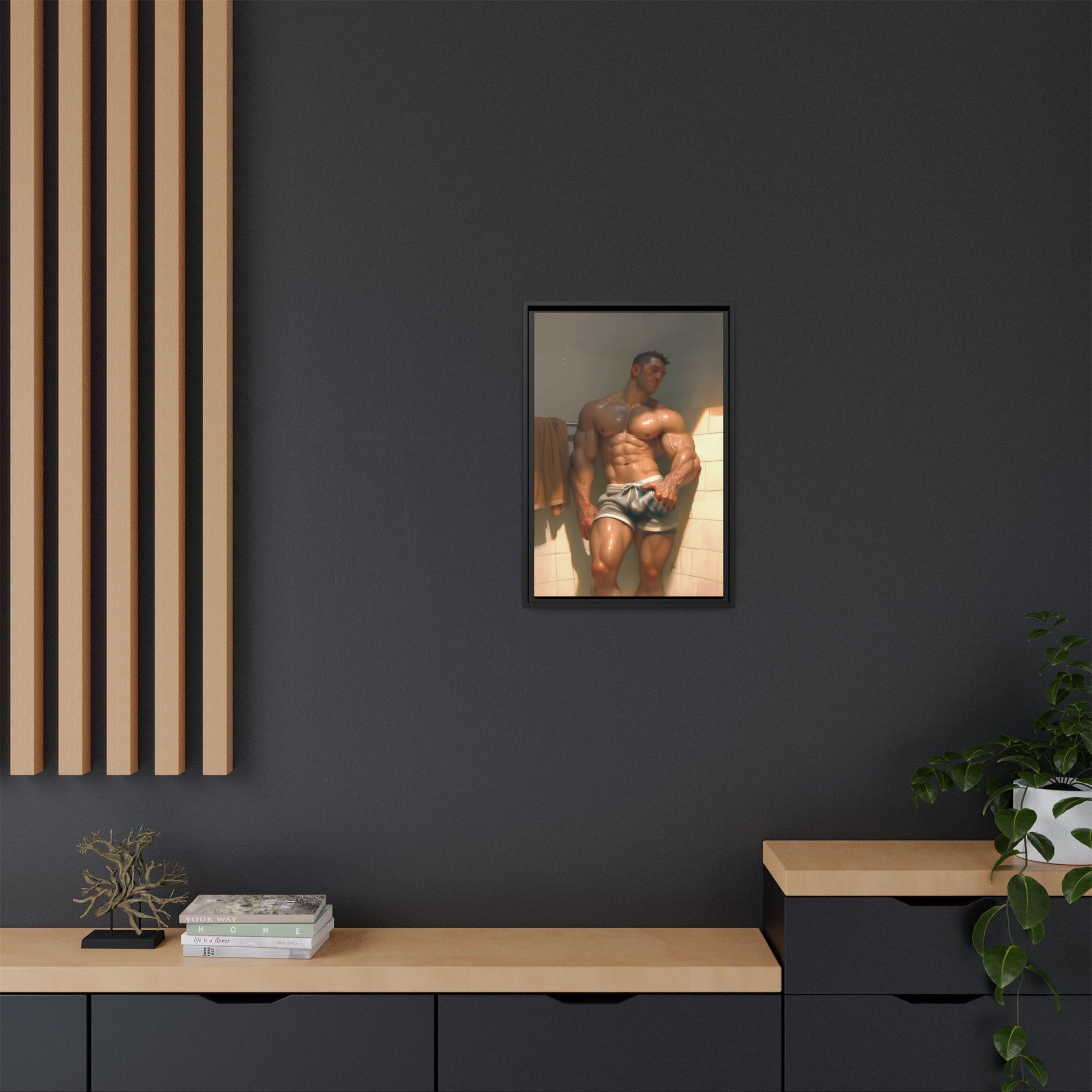 This framed matte canvas brings a bold, cheeky moment into a private corner of your home with unapologetic humor and vibrant color. The image captures a cartoon-strong figure in an intimate pre-shower gesture — playful, a little rough around the edges, and meant for viewers who appreciate adult, tongue-in-cheek art. Hung on a bathroom wall, in a personal studio, or inside a dedicated art space, the print creates a wink-and-nudge atmosphere that sparks conversation and lightens the mood.